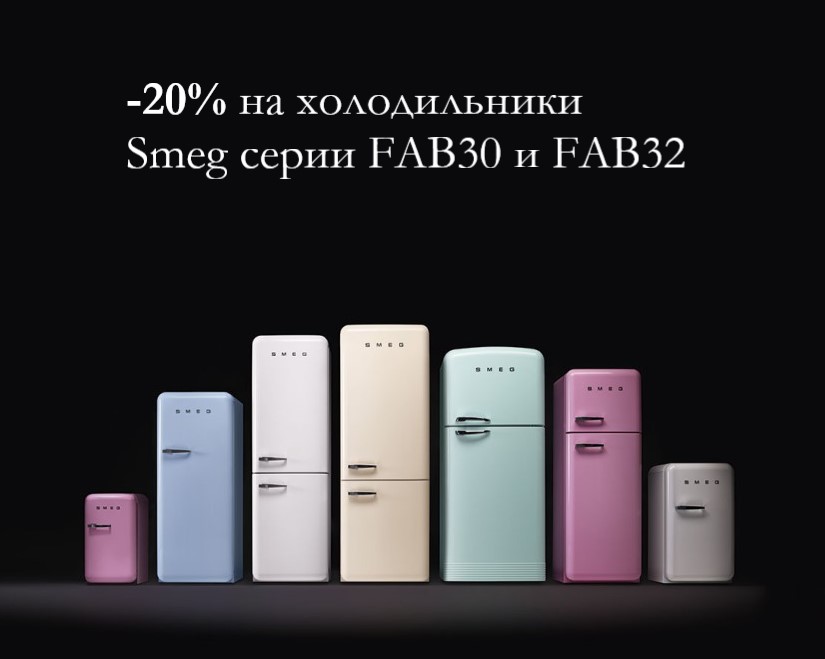 1. На весь ассортимент двухкамерных холодильников Smeg FAB скидка 20%! В акции участвуют позиции из наличия на складе, а также приборы под заказ из Италии.